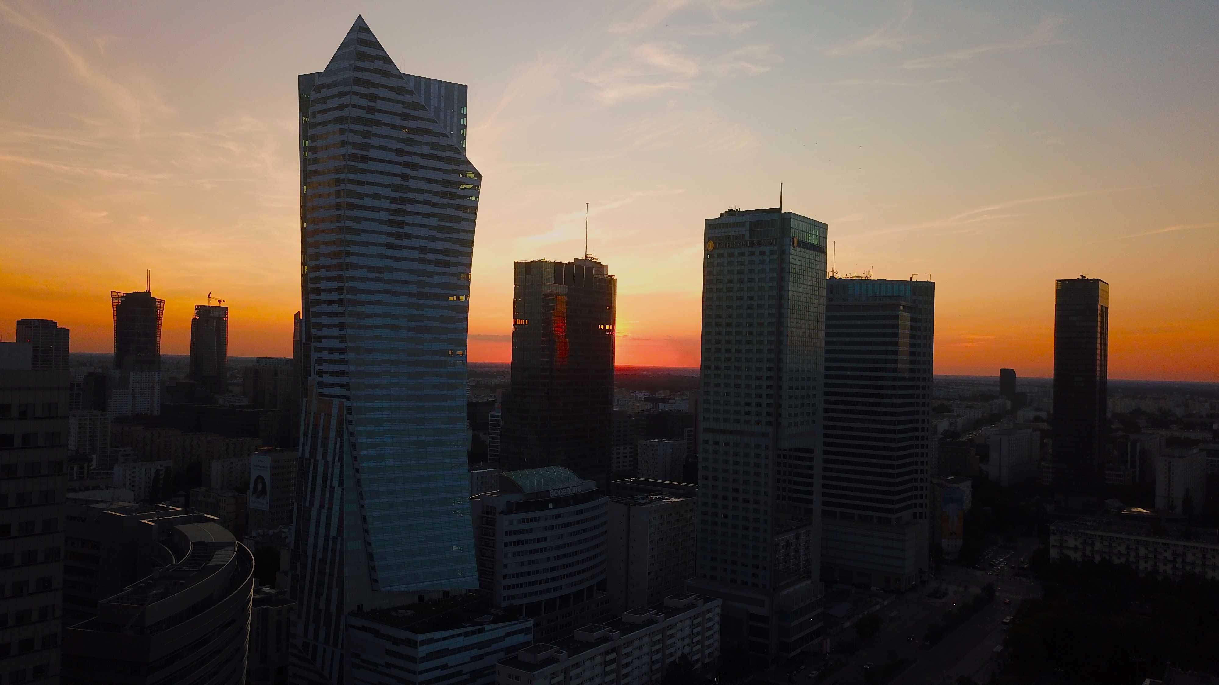 Stunning skyline of a modern city at sunset, featuring skyscrapers and a vibrant horizon Warszawa